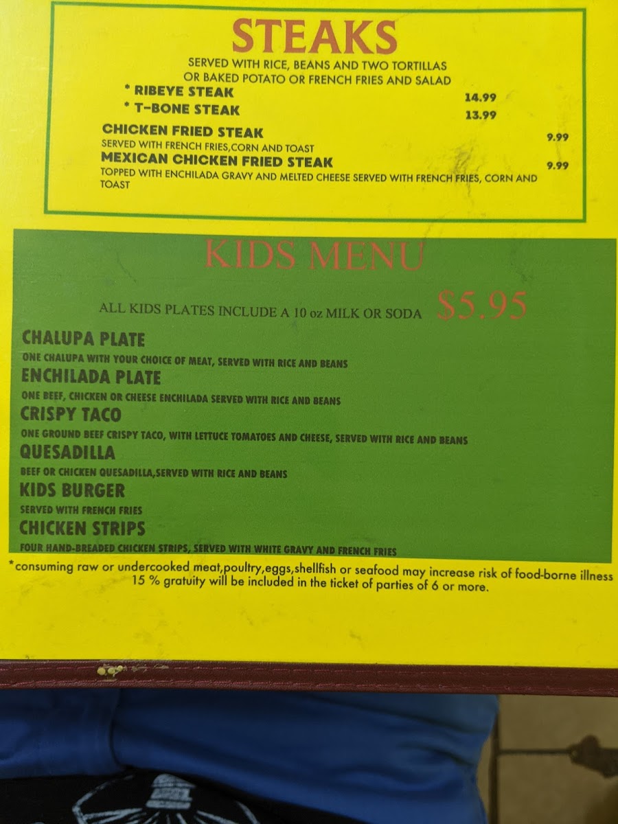 10 oz. t-bone, 2 eggs, beans, potatoes, and 2 tortillas. consuming raw or undercooked meat, poultry, eggs, shellfish or seafood may increase risk of food-borne illness 15% gratuity will be included in the ticket of parties of 6 or more.