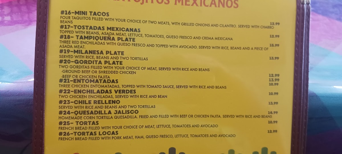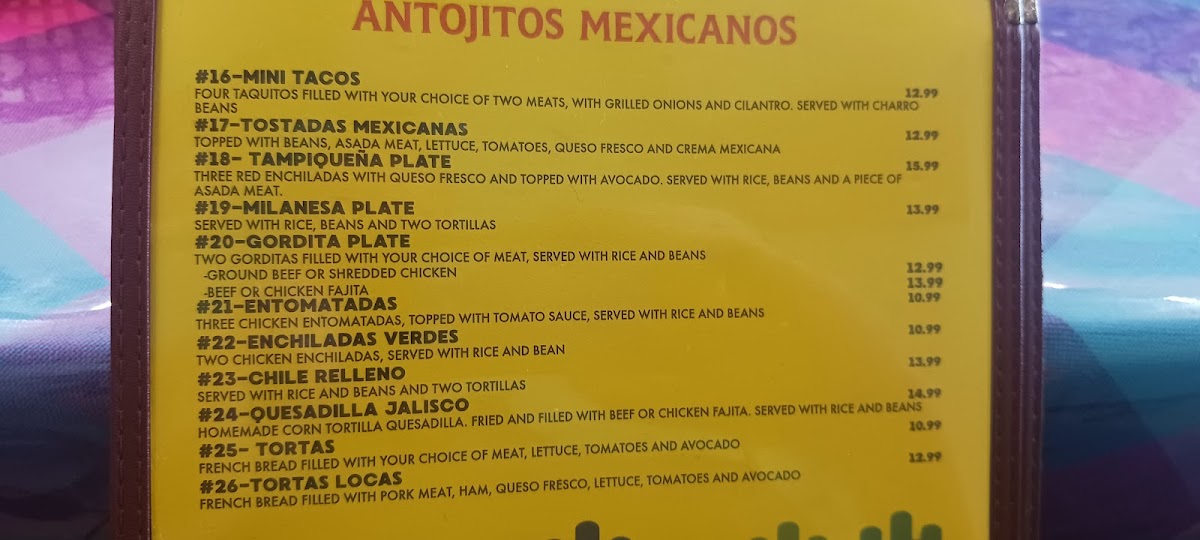 Omelette filled with your choice of meat, vegetables, and topped with cheese. Served with beans, potatoes, and 2 tortillas. consuming raw or undercooked meat, poultry, eggs, shellfish or seafood may increase risk of food-borne illness 15% gratuity will be included in the ticket of parties of 6 or more.